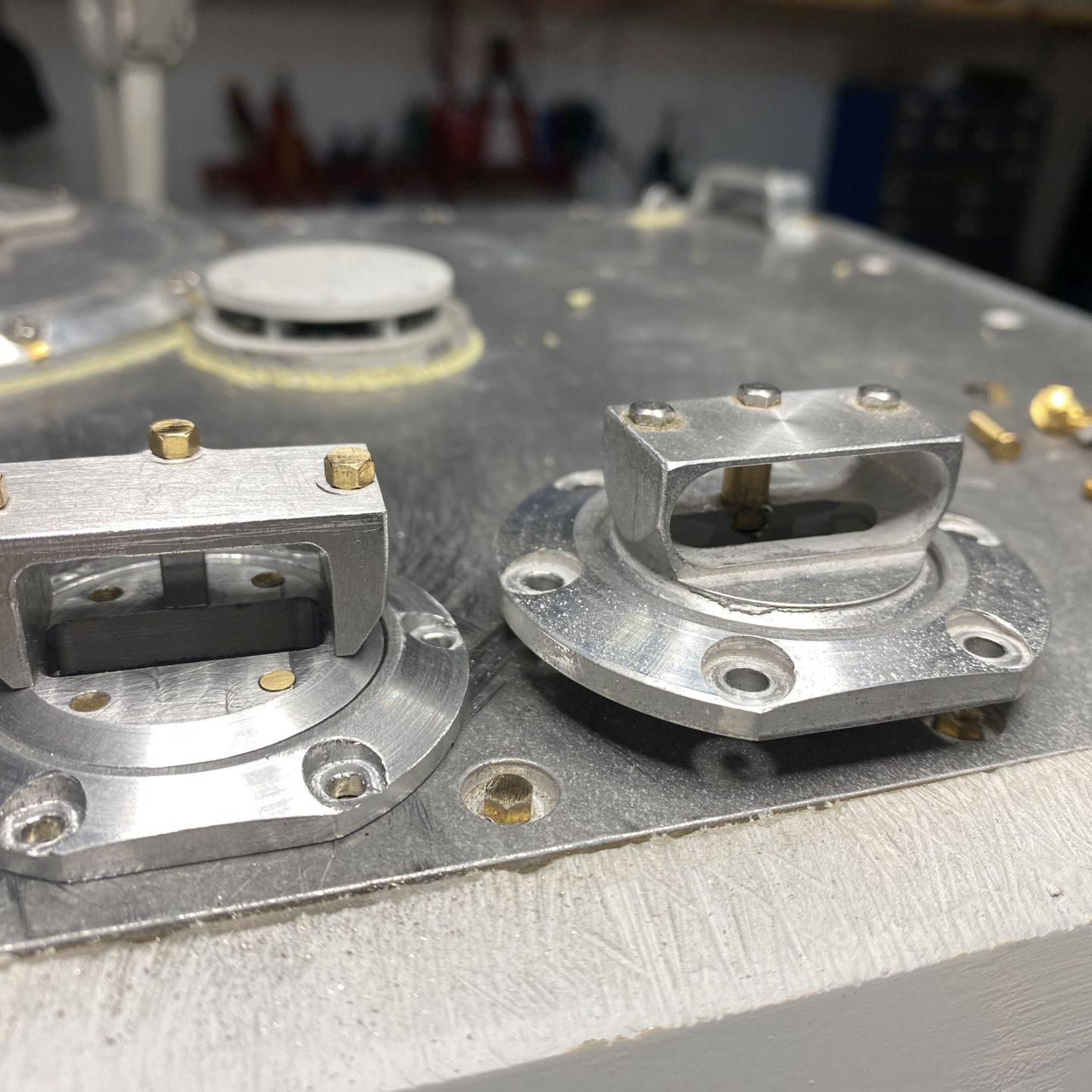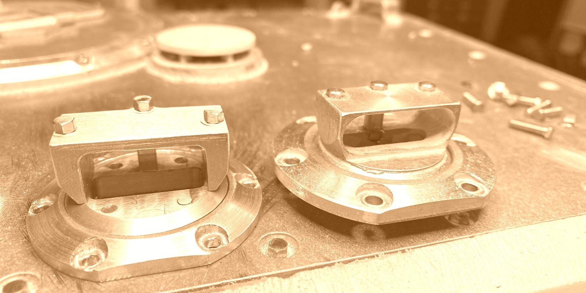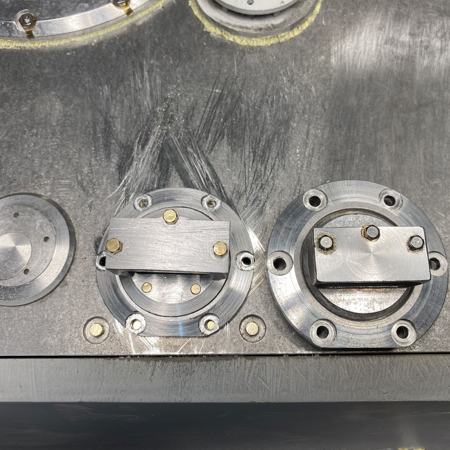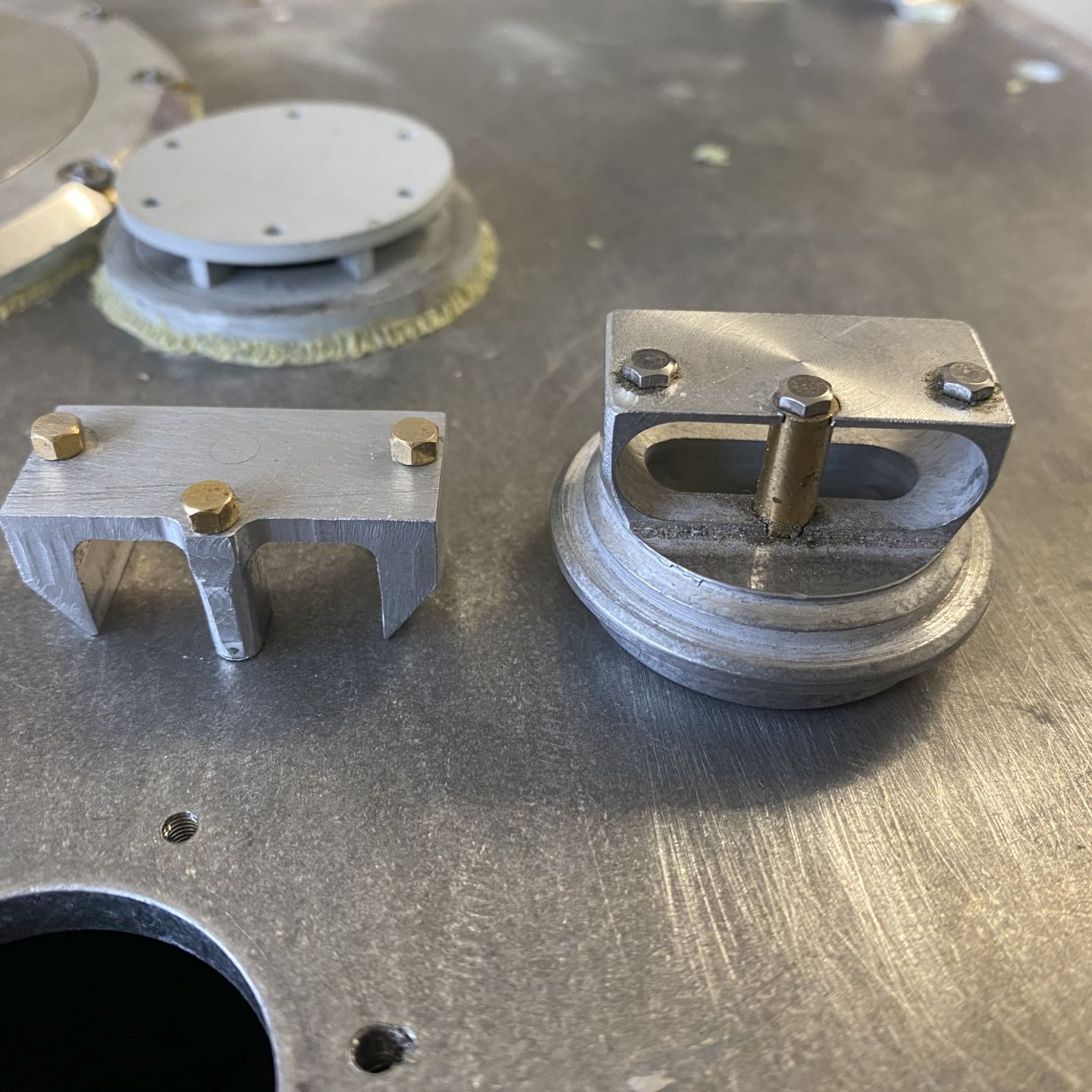 Alle Teile sind aus Aluminium gefertigt. Die Spiegelpanzerung entstand aus 18mm Alu und wurde anschließend auf der Drehmaschine angepasst. Der Teller und das Gegenstück habe ich aus 5mm Aluminium gefertigt. Danach wurden alle Teile auf ihre jeweiligen Endmaße gefräst. Wie im Original sind alle Teile miteinander verbolzt, oder verschraubt.