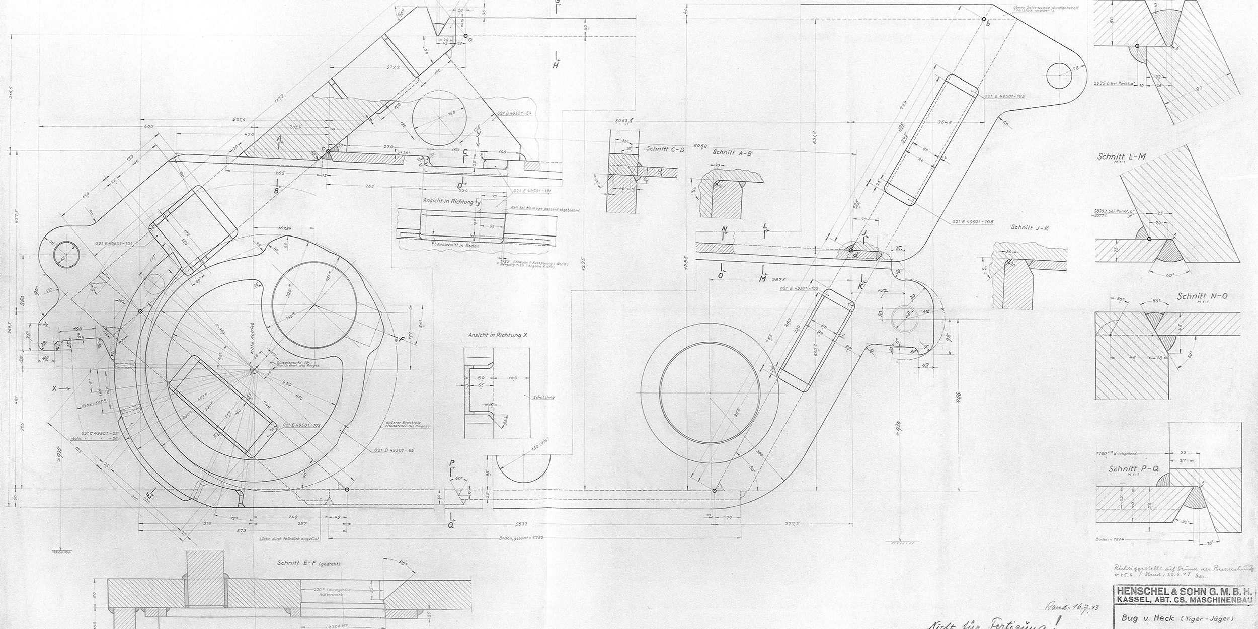 The drawings are labeled with „HSK (Henschel Kassel)“ and a number, or „Wa Prüf“ and a number beginning with 021. However, manufacturer drawings are often prototypes and were improved or modified over time. The drawings from the Waffenprüfamt are considered „official“ drawings used for the production of corresponding parts and assemblies. Nevertheless, changes based on frontline experiences were also incorporated (e.g., additional hooks for spare track links). The drawings themselves are not always precise due to age, storage conditions, and the fact that the originals were rolled or folded. Therefore, measurements should not be directly taken from the drawings and should always be verified and ideally cross-referenced with original photographs.